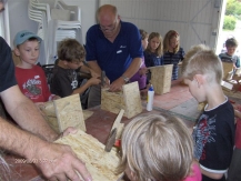 Nach der Führung durch die Vogelvolieren versammelten sich alle im überdachten Freisitz. Gestaltet ist der Raum nach dem Hobby Vogelzucht. An den Wänden hängen ca. 40 alte Vogelkäfige, die von Edwin und Heidi Kriebel gesammelt wurden. Daher kann man sehen wie Vögel schon vor 100 Jahren gehalten und gezüchtet wurden. Der älteste Käfig ist wie ein Schloss gebaut und stammt aus dem Jahr 1924. Die Kinder konnten auch eine Vogelnestsammlung mit Eiern, die von den Vereinsmitgliedern in ihren Volieren gesammelt wurden, bestaunen. Herr Kriebel erklärte die verschiedenen Eier und deren Größe, vom Kirschkernbeißer bis zum kleinen Tigerfink. Anschließend wurde der Durst mit Limonade gestillt. Nun stand der Arbeitseinsatz auf dem Programm, der Vogelnistkastenbau: